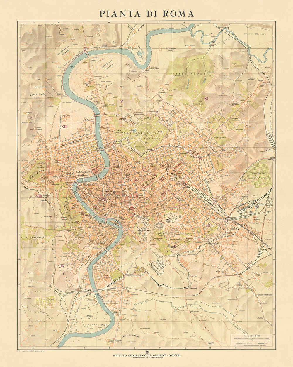 Producida por el Istituto Geografico De Agostini durante su año de fundación, la "Pianta di Roma" no solo se erige como un valioso documento histórico, sino también como un testimonio del legado perdurable de la cartografía italiana. La creación del mapa en un momento crucial tanto en la historia del cartógrafo como en la de la ciudad que representa lo convierte en un recurso invaluable para historiadores, cartógrafos y cualquier persona fascinada por la evolución de los paisajes urbanos. Poseer este mapa es como poseer una parte del pasado histórico de Roma, presentado a través de la lente de una de las instituciones geográficas más estimadas de Italia.