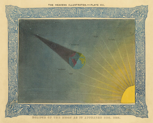 La obra de arte utiliza hermosamente el color y un diseño intrincado para representar el eclipse de la luna tal como se observó en diciembre de 1833. Los ricos tonos coloreados a mano y las anotaciones precisas ofrecen una fascinante visión de los estudios astronómicos históricos. Coleccionistas y entusiastas apreciarán la combinación de rigor científico y elegancia artística.
