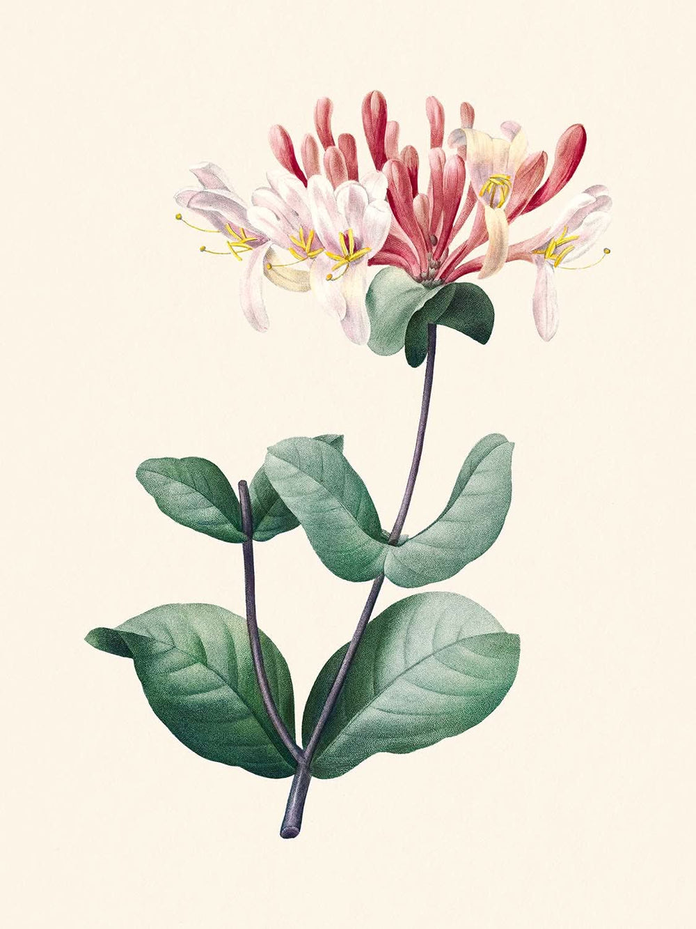 Madreselva, publicada por primera vez en 1802, es una impresionante ilustración botánica de Pierre-Joseph Redouté, uno de los artistas botánicos más importantes de la historia. Redouté era famoso por su trabajo en el castillo de Malmaison, donde, a instancias de Josefina Bonaparte, pintó la exquisita flora de la finca. Nacido en Bélgica, el talento de Redouté como pintor lo llevó a convertirse en tutor de María Antonieta antes de centrarse en el arte botánico, produciendo más de 2100 pinturas de más de 1800 especies a lo largo de su prolífica carrera.