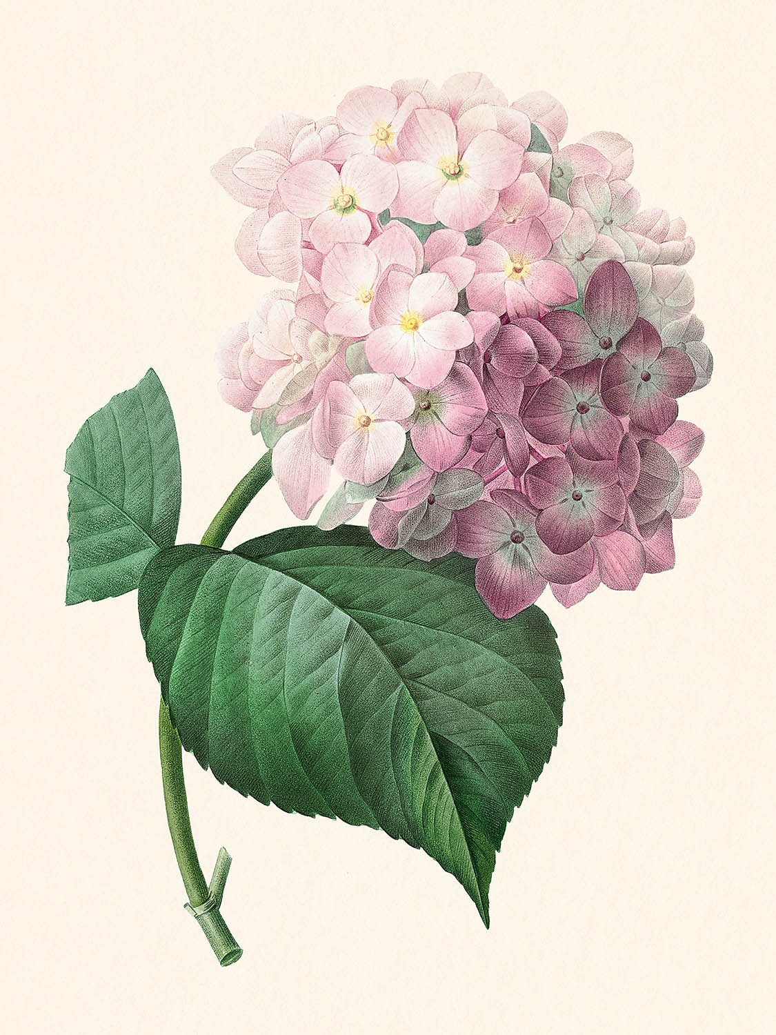 Ilustración botánica de hortensia por Pierre-Joseph Redouté, 1827