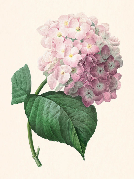 "Hydrangea" es un testimonio del extraordinario talento y dedicación de Redouté. La ilustración captura los sutiles degradados de los pétalos rosados y blancos y las exuberantes hojas verdes, exhibiendo una impresionante atención al detalle que hace que su trabajo sea tan apreciado. La paleta de colores suaves y las líneas precisas crean una representación realista que agrega un toque de elegancia de la naturaleza a cualquier espacio.