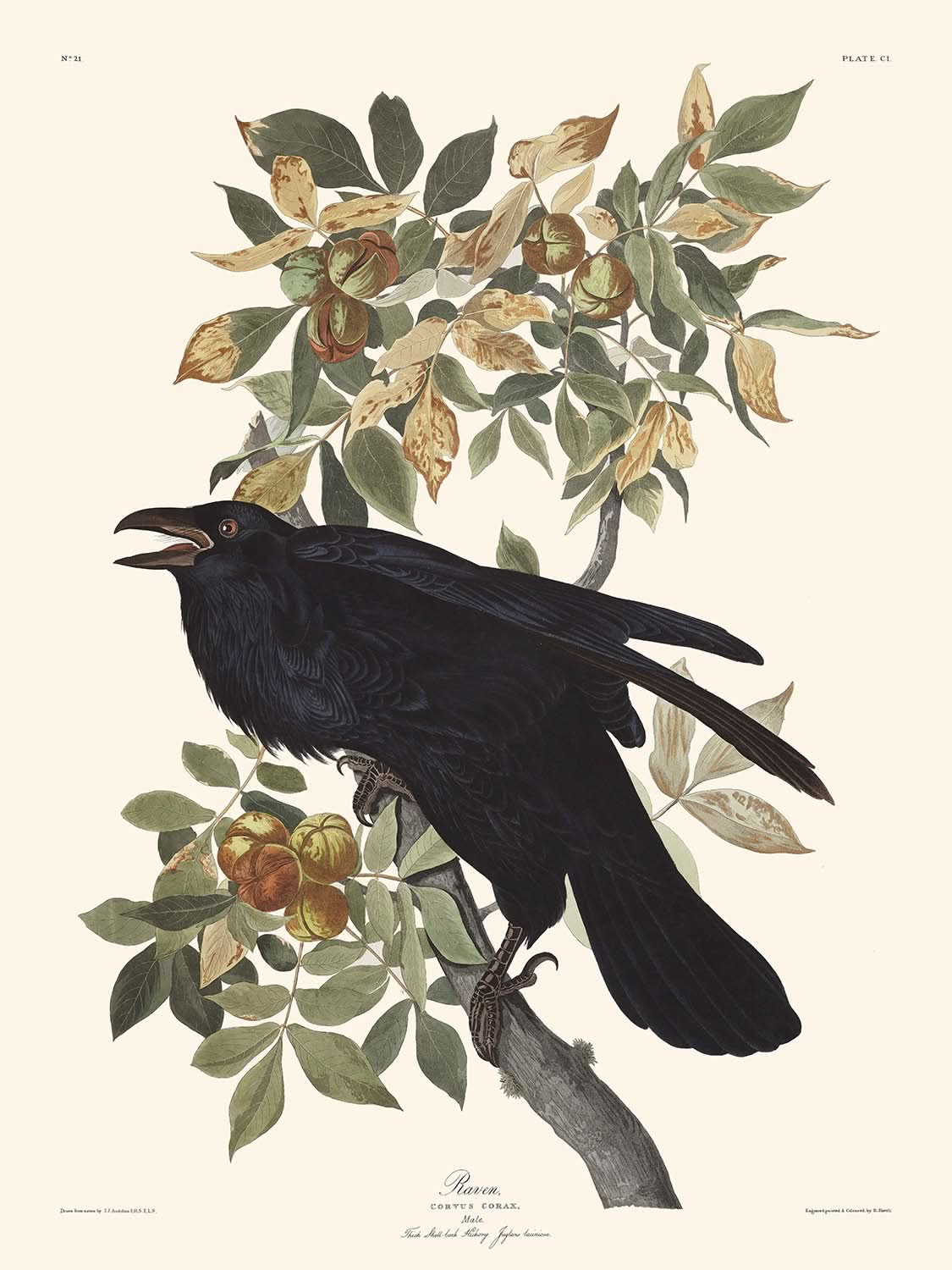 El Cuervo, publicado por primera vez en 1827, es una ilustración cautivadora y detalladamente intrincada del renombrado naturalista y artista John James Audubon, que proviene de su monumental obra, Aves de América.