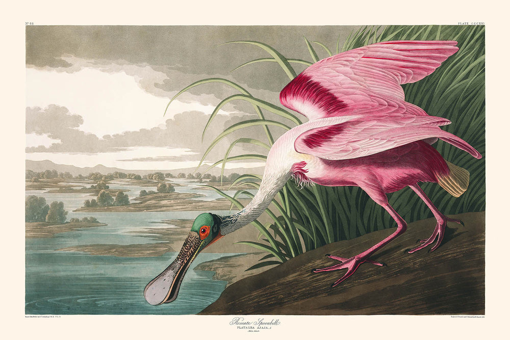 John James Audubon es celebrado por su excepcional precisión y arte al representar la vida aviar. Su trabajo es un testimonio de su dedicación a capturar el mundo natural con precisión, haciendo de esta obra de arte un legado tanto de arte como de educación. El "Espátula Rosada" es conocida no solo por su detalle realista, sino también por su elocuente representación del hábitat natural del ave.