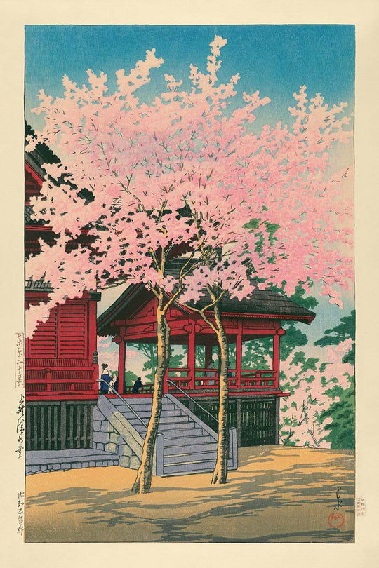 El arte de Hasui Kawase es conocido por su delicada interacción de luz y sombra, invitando a los espectadores a reflexiones tranquilas sobre el tiempo y el espacio. "El Templo Kiyomizu en Ueno" captura esto bellamente, presentando una escena idílica marcada por intrincados detalles arquitectónicos y el magnífico uso de tonos apagados... ¡y un enorme cerezo en flor, por supuesto! La pieza muestra las habilidades expertas de Kawase en la representación del ambiente de la tarde, donde los sutiles matices del templo y el follaje circundante reflejan la tranquilidad de la escena.