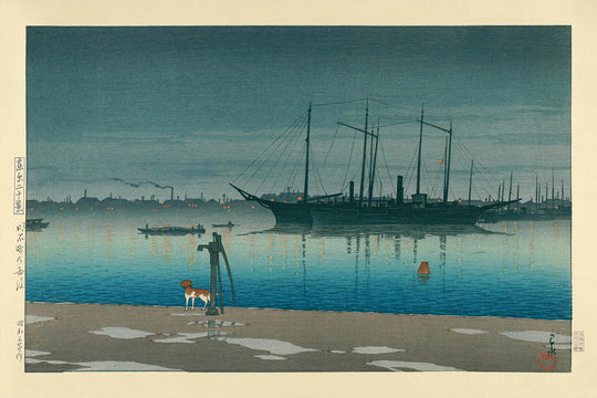 "Después de la lluvia en la ciudad de Akashi" de Hasui Kawase es una cautivadora impresión en madera, creada en 1935, que captura bellamente la esencia serena de la tranquilidad posterior a la lluvia en la ciudad de Akashi. Hasui Kawase fue un artista influyente en el movimiento Shin-Hanga, conocido por revitalizar las impresiones tradicionales ukiyo-e con estilos modernos e influencias occidentales. Sus obras son veneradas por su belleza serena, paleta distintiva y sutil interacción de luz y sombra.