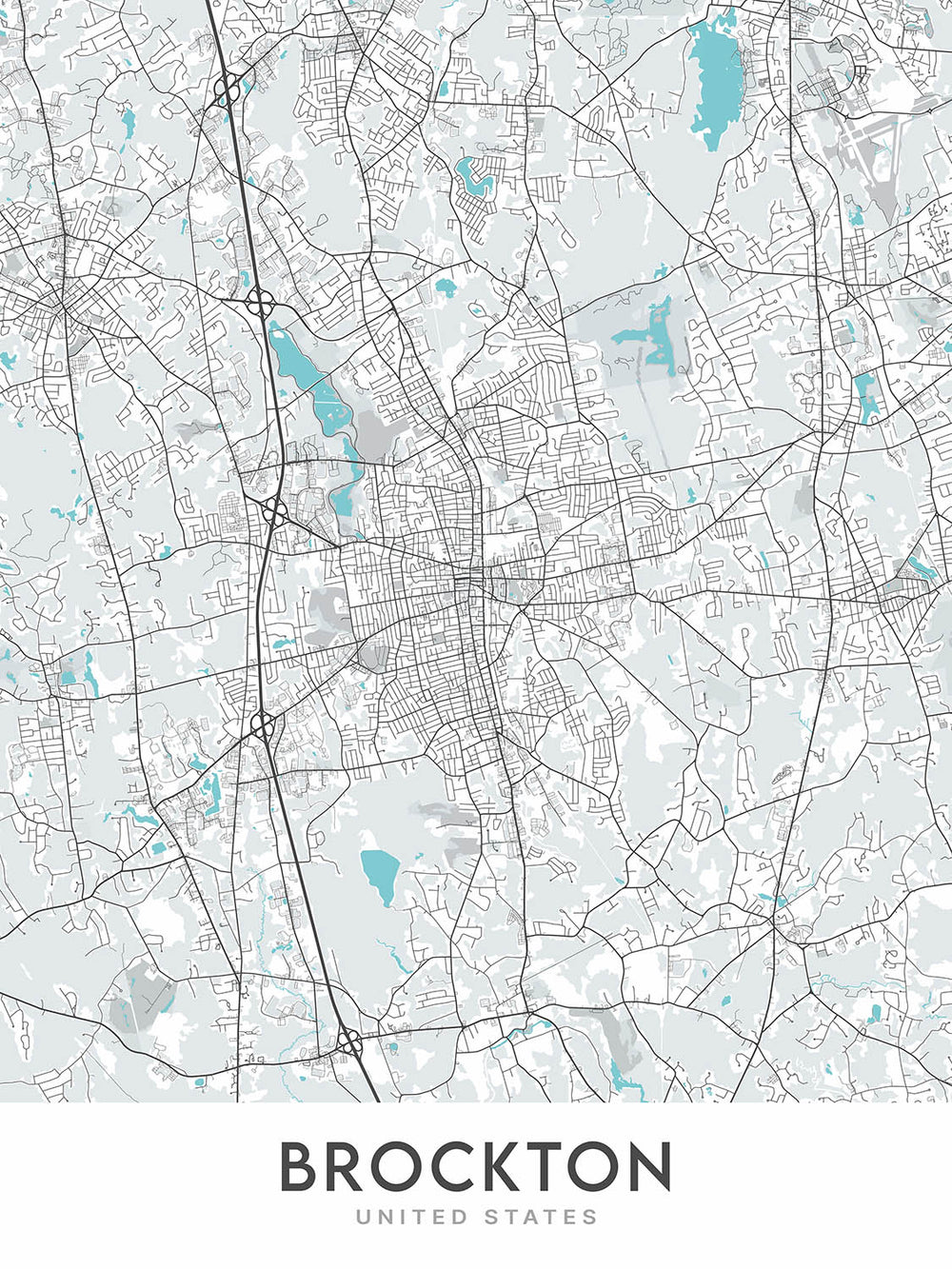 El mapa de Brockton es un mapa de la ciudad moderno que se centra en los intrincados detalles del trazado de las calles de la ciudad. El mapa no contiene etiquetas, lo que permite al espectador centrarse únicamente en la representación visual de la ciudad. El mapa cubre una parte importante de Brockton, incluido el centro de la ciudad, los vecindarios residenciales y las áreas industriales. También se extiende para incluir partes de las ciudades vecinas de Avon, Holbrook, Randolph, Stoughton y Abington.