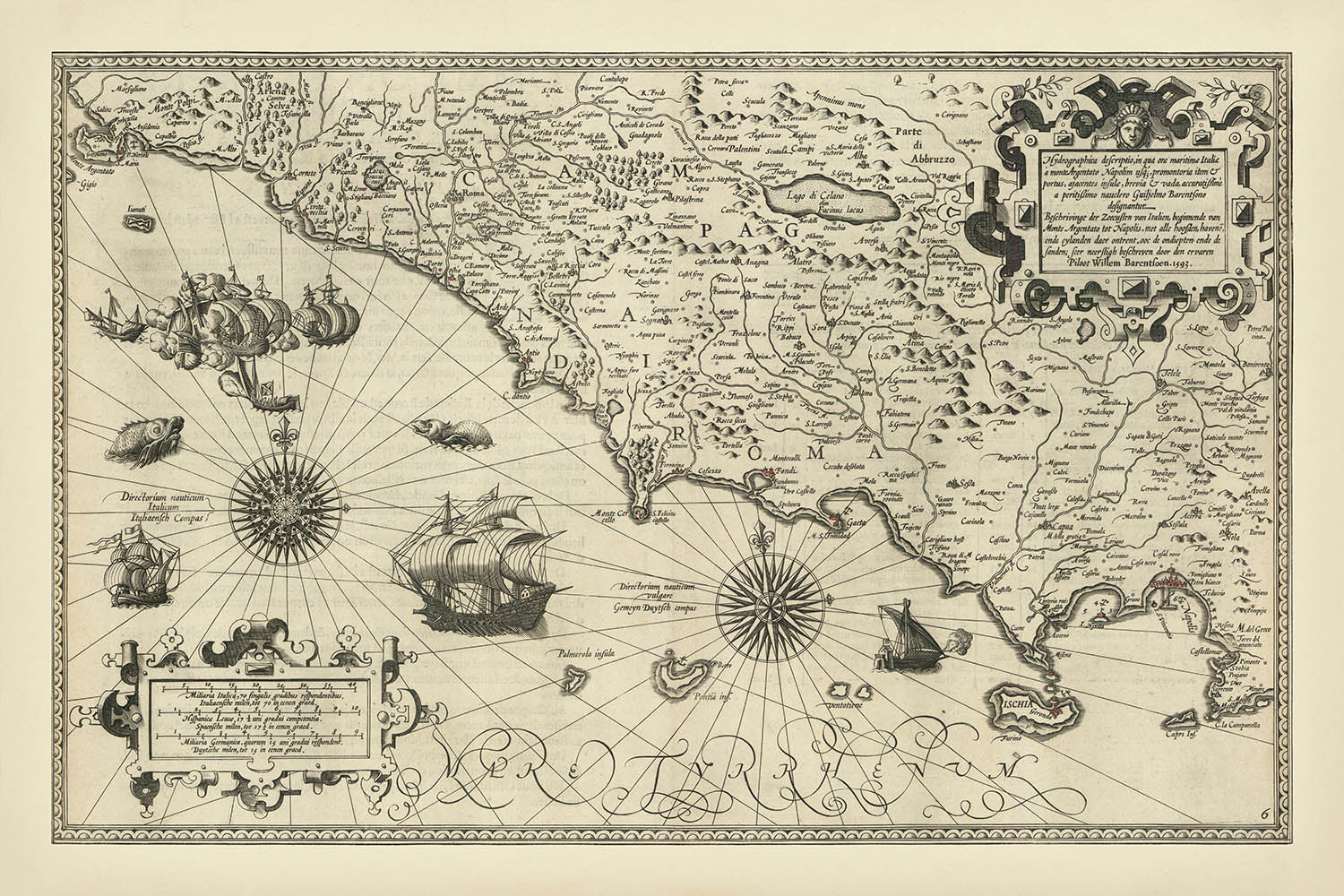 First Map of the Italian Mediterranean Coat by Barentsz, 1595: Naples, Rome, Capri, Sorrento, Gaeta, Ischia