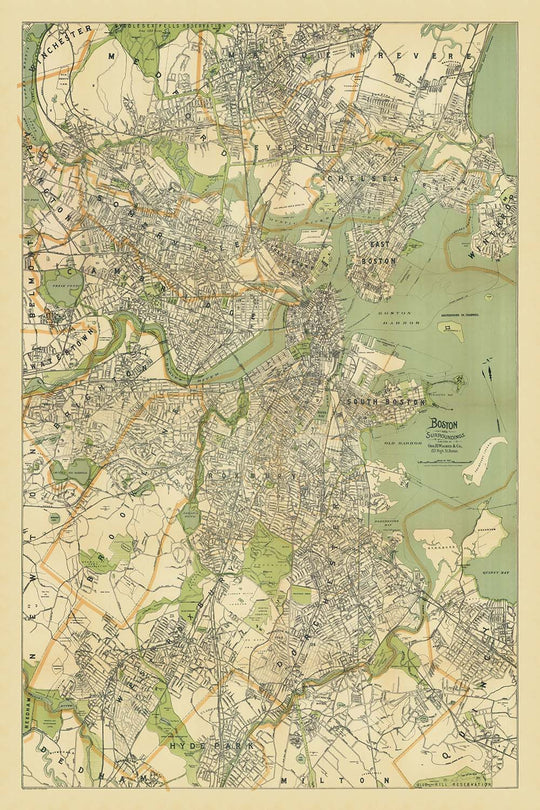 Entre las características más cautivadoras del mapa se encuentran sus representaciones de los célebres parques y espacios públicos de Boston. El Boston Common y el Public Garden, ubicados en el centro de la ciudad, están claramente marcados, al igual que las extensiones verdes de Franklin Park y el Arnold Arboretum en el sur. Los Back Bay Fens y Jamaica Pond ofrecen más evidencia del compromiso de la ciudad con los espacios verdes, reflejando la influencia del sistema de parques Emerald Necklace de Frederick Law Olmsted. Estos hitos, junto con los serpenteantes ríos Charles y Mystic y el icónico puerto de Boston, proporcionan un rico contraste con la densa trama urbana de la ciudad y subrayan la importancia de la naturaleza en la identidad cívica de Boston.