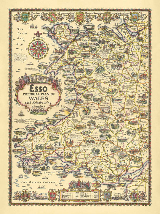 El "Plan Pictórico de Esso de Gales con los Condados Vecinos," elaborado por el estimado A.E. Taylor en 1934, es una cautivadora mezcla de arte y cartografía. Este mapa te transporta a una época pasada, capturando la esencia de Gales y sus condados ingleses vecinos con un vibrante tapiz de ilustraciones. Taylor, conocido por su talento artístico, infundió a este mapa detalles intrincados que celebran la riqueza cultural y geográfica de la región. Cada trazo de su pluma te invita a explorar los paisajes históricos y las bulliciosas carreteras que definieron los viajes a principios del siglo XX.
