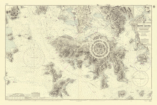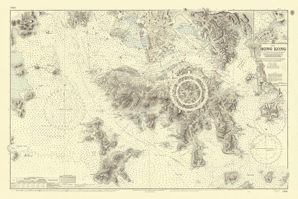 - Publicada por primera vez en 1843 por el Almirantazgo Británico, basada en encuestas de Sir Edward Belcher y actualizada más tarde por otros topógrafos de la Royal Navy. El mapa aquí muestra Hong Kong en 1953.