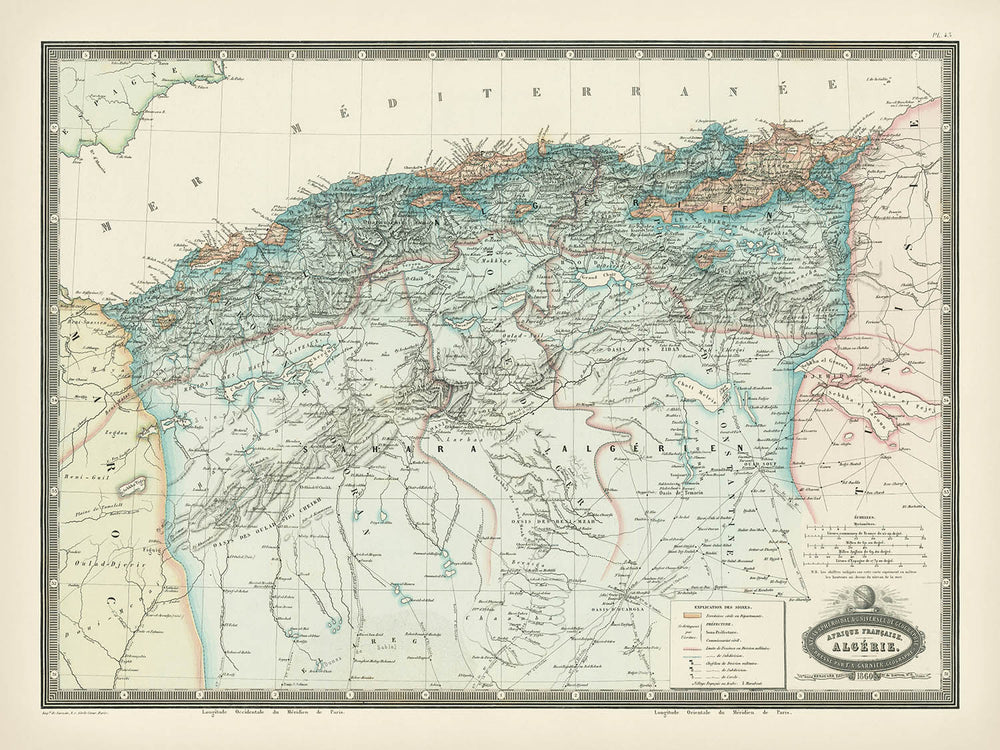 La atención al detalle de Garnier es evidente en la cuidadosa representación de las ciudades y pueblos de Argelia, incluyendo Argel, Orán y Constantina. Estos bulliciosos centros de comercio y cultura están intrincadamente tejidos en el mapa, proporcionando una visión del desarrollo urbano de la época. La inclusión de pueblos menos conocidos como Tlemcen y Biskra añade profundidad, ilustrando la complejidad y riqueza de la geografía humana de Argelia. Cada asentamiento es un testimonio de la vibrante historia y el tapiz cultural de la región.