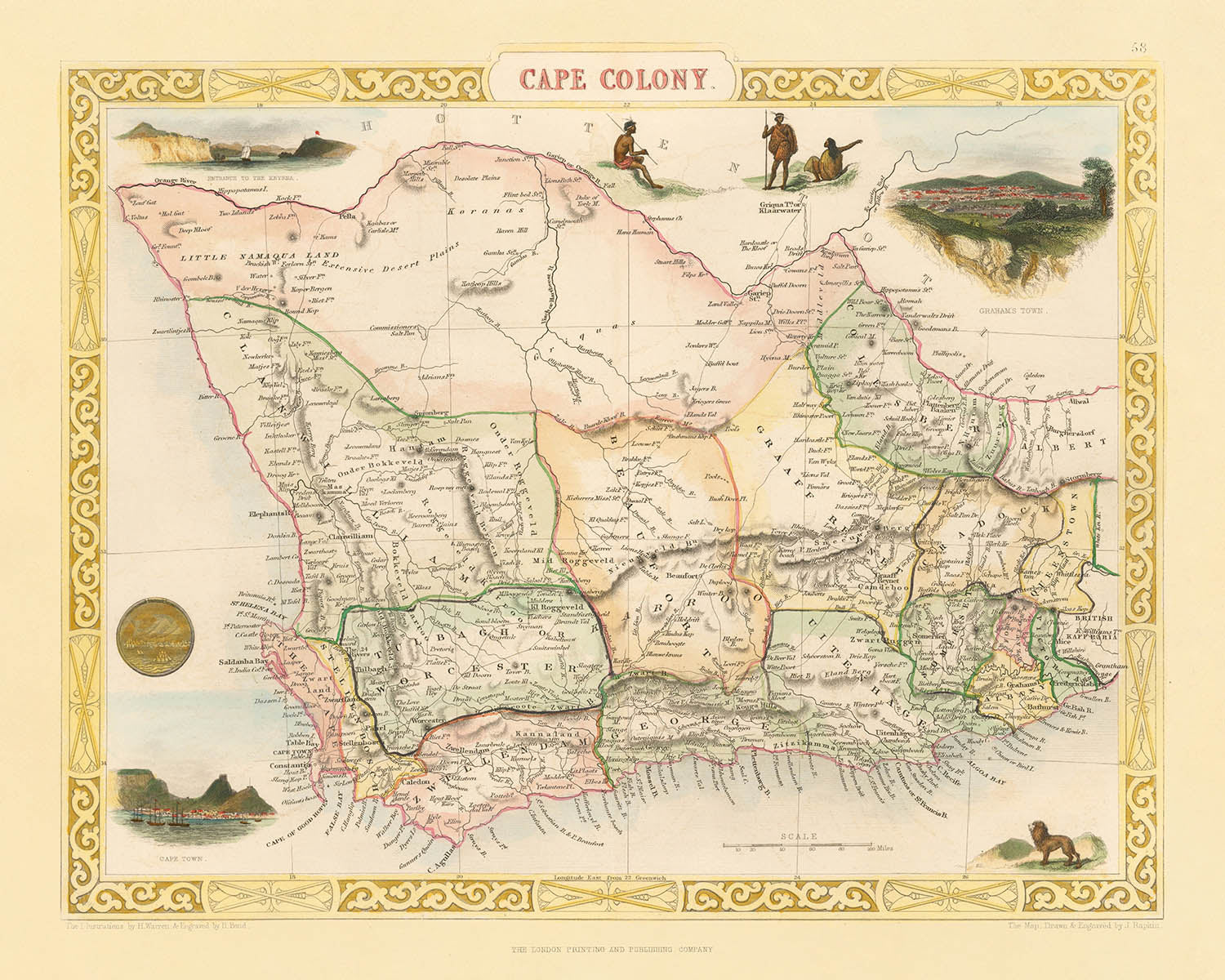 John Tallis, celebrated as one of the last great decorative mapmakers, imbued his creations with both scientific precision and artistic flourish. His maps are prized for their elegant borders and evocative vignettes, and “Cape Colony” is no exception. Here, Tallis’s artistry shines through in the beautifully rendered illustrations of Cape Town, Graham Town, and the Entrance to the Knysna—each scene a glimpse into the landscapes and settlements that defined the region. These vignettes, carefully engraved and hand-colored, transform the map into a visual journey through the Cape’s storied past.