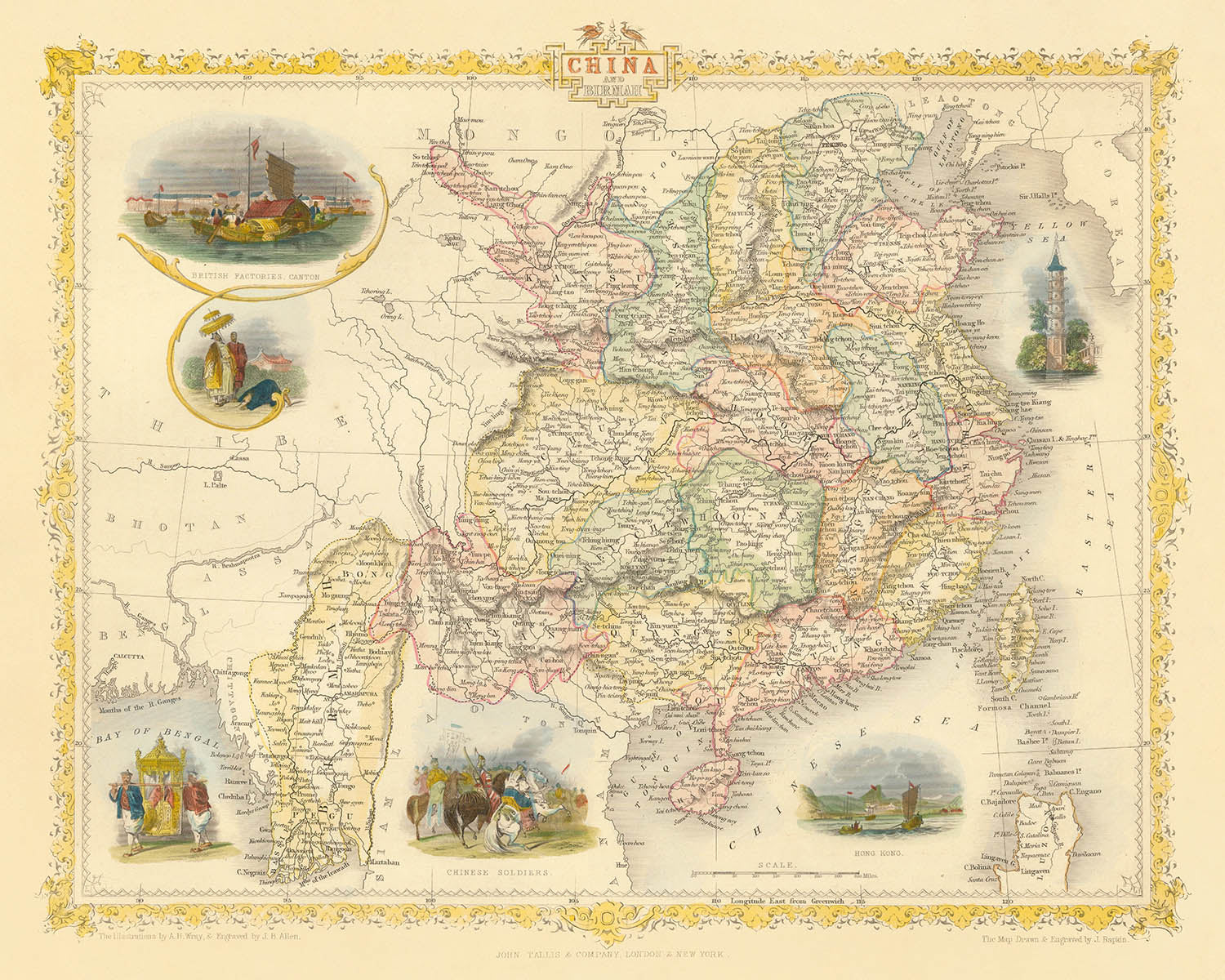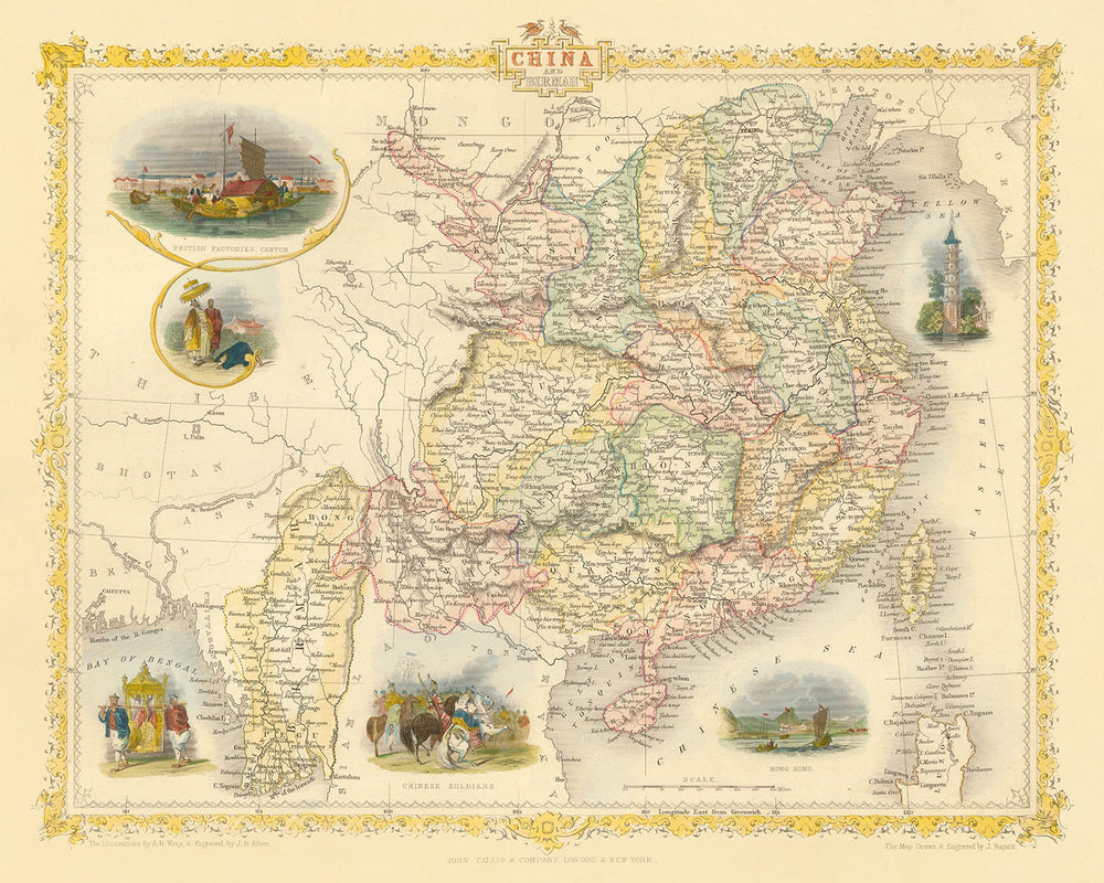 John Tallis, celebrated as one of the last great decorative mapmakers, imbued his works with a distinctive blend of precision and artistry. His maps are renowned for their intricate borders and evocative vignettes, and this piece is no exception. Here, Tallis’s hand brings to life not only the political boundaries and provinces of China and Burma but also the dynamic interplay of colonial ambition and indigenous tradition. The map’s decorative vignettes—such as the bustling British Factories at Canton and the panoramic bird’s-eye view of Hong Kong—reflect the burgeoning trade and cultural exchange between East and West, while offering a glimpse into the daily life and military presence of the region.