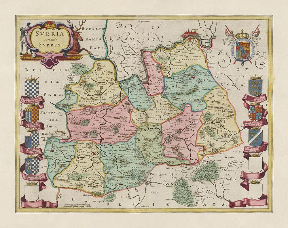 Viejo Mapa de Surrey en 1665 por Joan Blaeu: Woking, Guildford, Croydon, Richmond, Kingston, Reigate