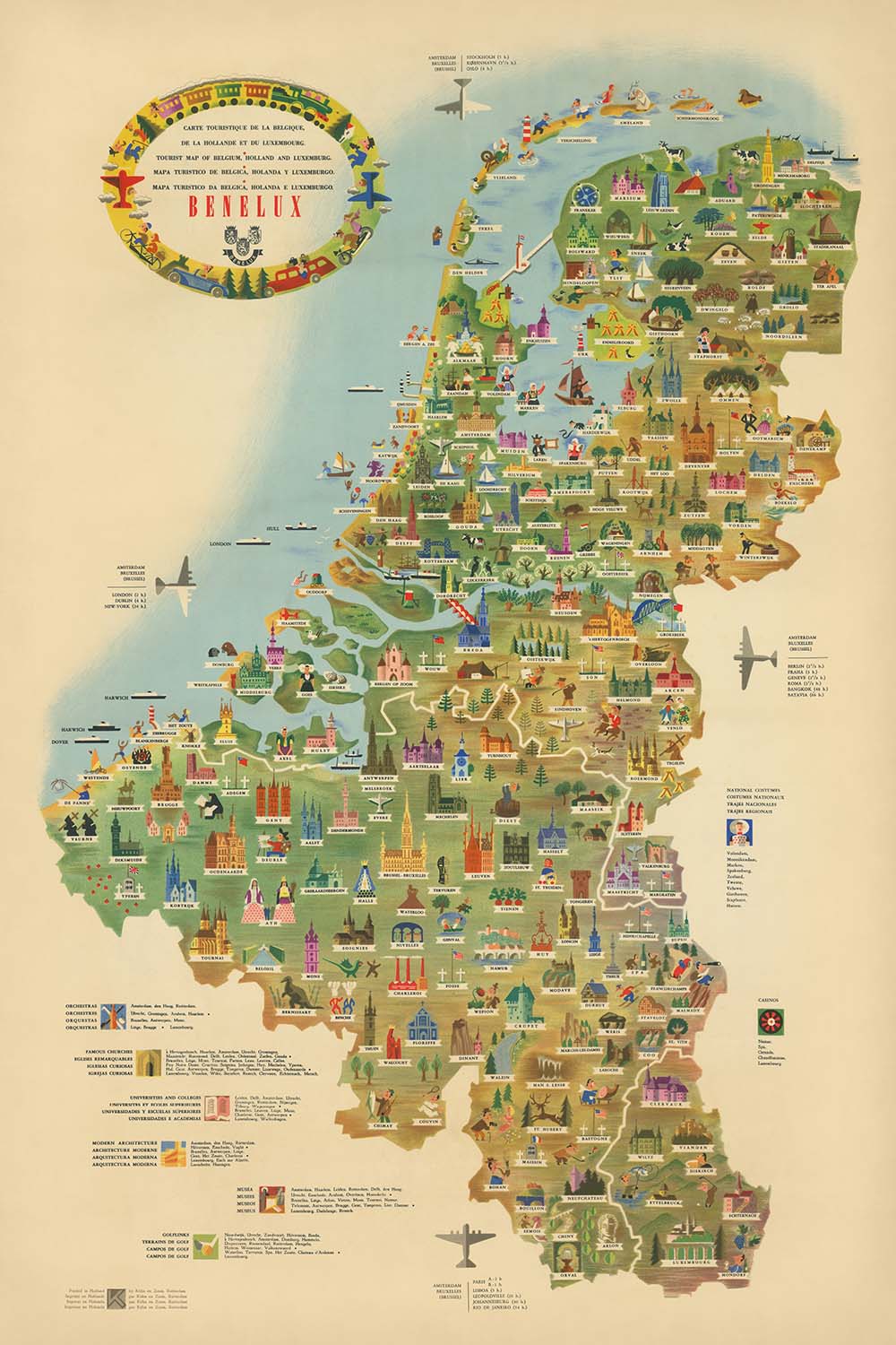 The map’s design is a feast for the eyes, adorned with lively illustrations of iconic landmarks, windmills, castles, and cathedrals that define the cultural landscape of the Benelux countries. Major rivers such as the Rhine, Meuse, and Scheldt snake across the terrain, while the North Sea’s coastline frames the map’s western edge. Borders are clearly delineated, and the map is further embellished with national flags, coats of arms, and a decorative compass rose, offering a harmonious blend of artistry and information that was characteristic of the era’s finest cartographic works.