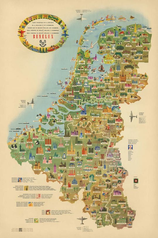Beyond its visual appeal, the map is rich in thematic detail, highlighting the leisure pursuits that flourished in the 1950s. Golf courses, hiking trails, and airports are marked with charming icons, reflecting the growing enthusiasm for travel and outdoor activities in the post-war years. Forests, parks, and hilly regions—particularly in southern Belgium and Luxembourg—are rendered in lush greens and gentle contours, while pictorial vignettes capture regional industries such as tulip cultivation in the Netherlands and beer brewing in Belgium. This thoughtful curation of content makes the map both a practical guide and a delightful artifact of mid-century tourism.