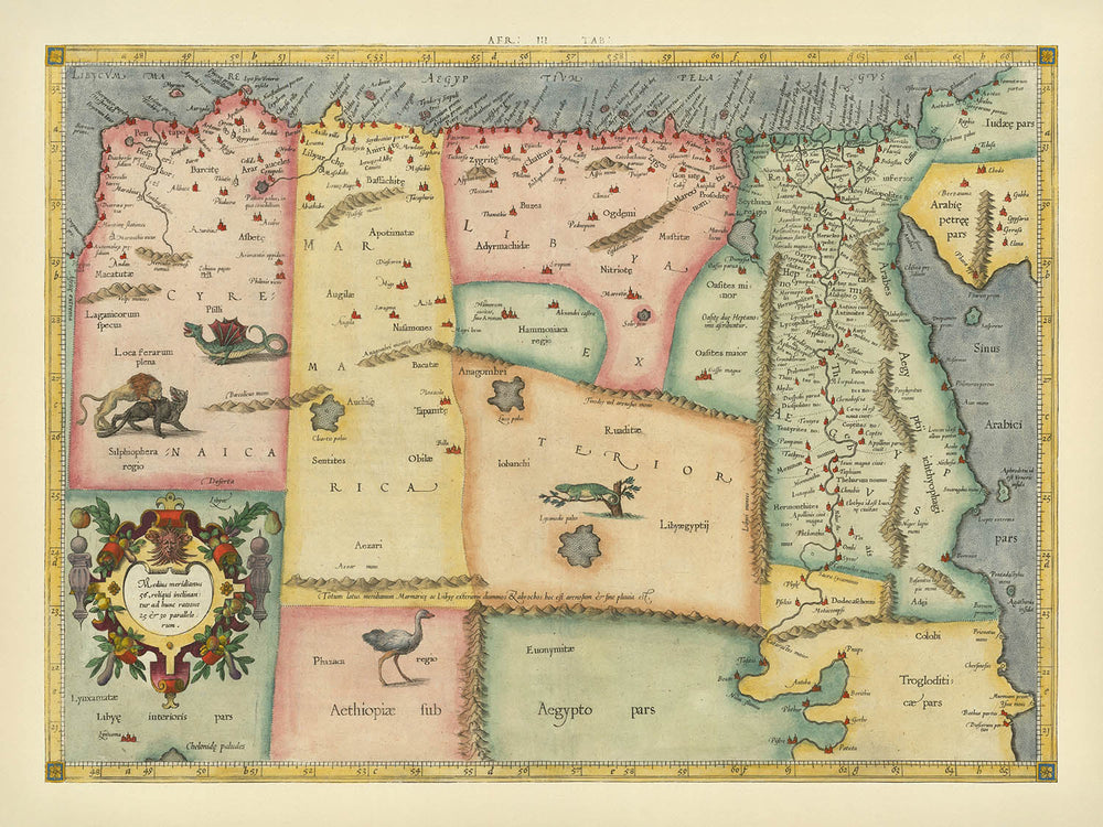 El arte de Mercator es evidente en las intrincadas ilustraciones del mapa, donde criaturas míticas como leones y avestruces deambulan por el paisaje. Estos adornos reflejan la fascinación medieval por lo desconocido y lo místico, integrándose sin problemas con el enfoque más científico del Renacimiento. La representación detallada de las cadenas montañosas y las divisiones regionales añade profundidad y dimensión, invitando a los espectadores a explorar los diversos terrenos del norte de África.