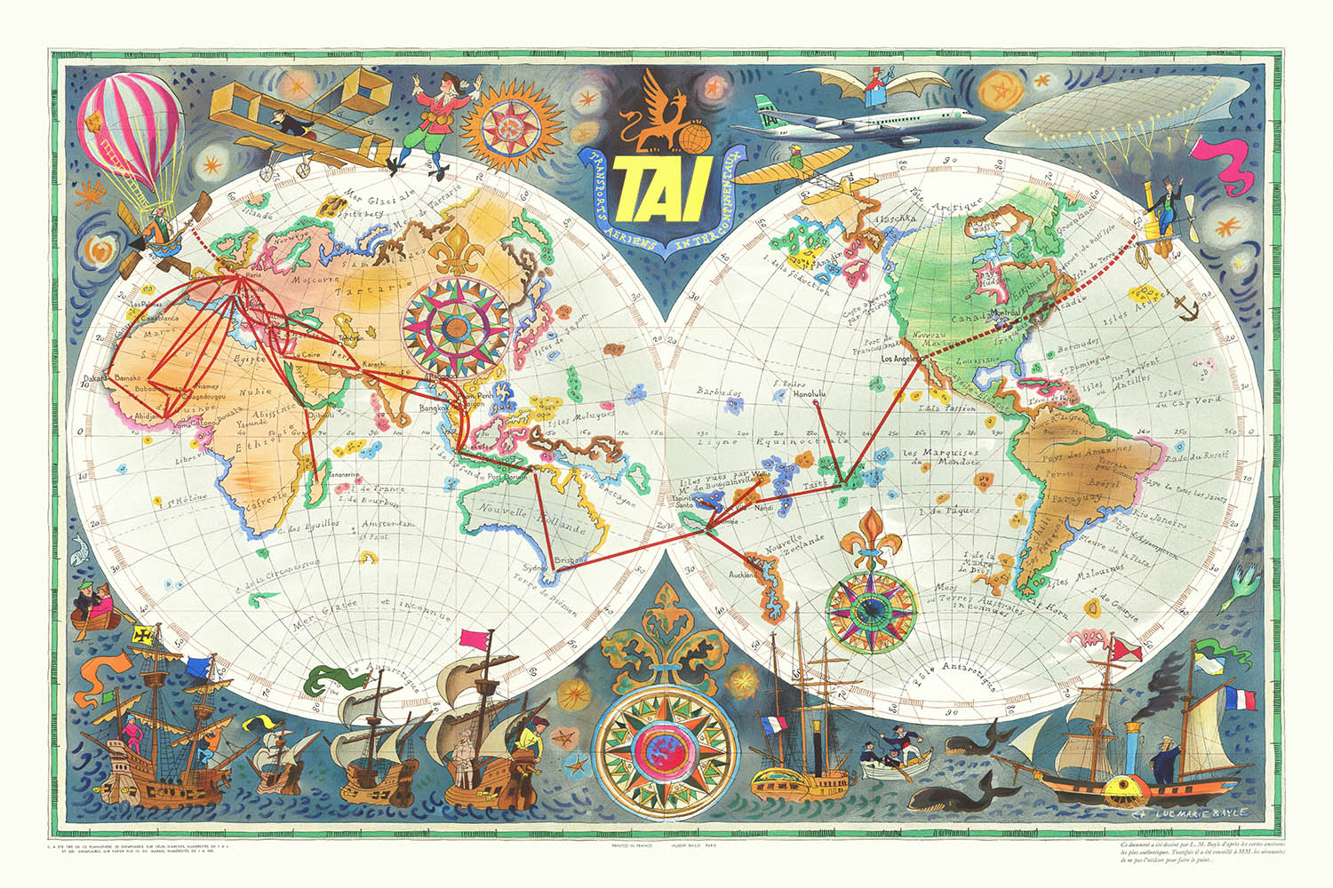 Mapa mundial de rutas de la antigua aerolínea TAI por Bayle, 1957