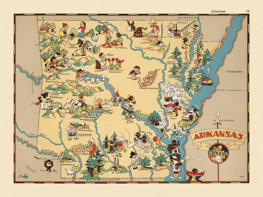 - The map uses vibrant, cartoonish illustrations to depict stereotypical scenes and cultural elements representative of Arkansas in the 1930s
