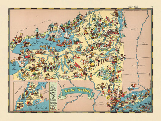 Beyond its natural wonders, the map celebrates the cultural and economic tapestry of the state. Whimsical illustrations of farming, dairy cows, and bustling factories pay homage to New York’s agricultural and industrial heritage. Recreational pursuits—fishing, hunting, skiing—dot the landscape, reflecting the state’s diverse opportunities for adventure and leisure. The presence of Native American figures and references to early colonial history further enrich the narrative, offering a nuanced glimpse into the layers of human experience that have shaped New York.