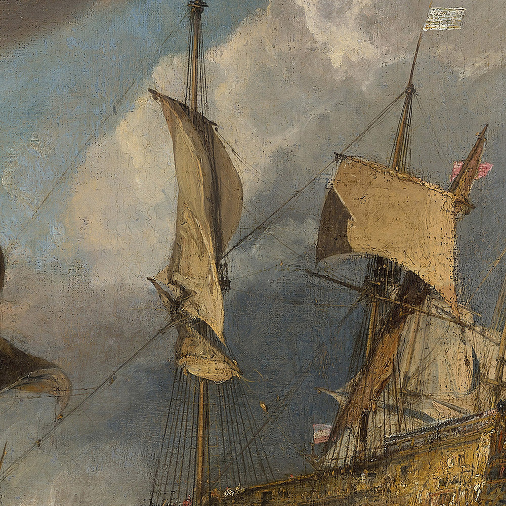 Turner (1775–1851) stands among the giants of British art, celebrated for his daring compositions and radical handling of light and weather. A prodigious talent who rose through the Royal Academy, he moved beyond topographical accuracy toward atmospheric truth, influencing generations of painters and reshaping the course of landscape and marine painting. His maritime works in particular reveal a lifelong fascination with ships, storm fronts, and the fragile human presence set against nature’s immensity.