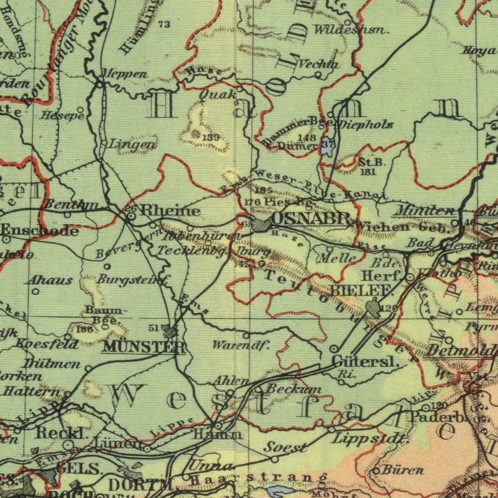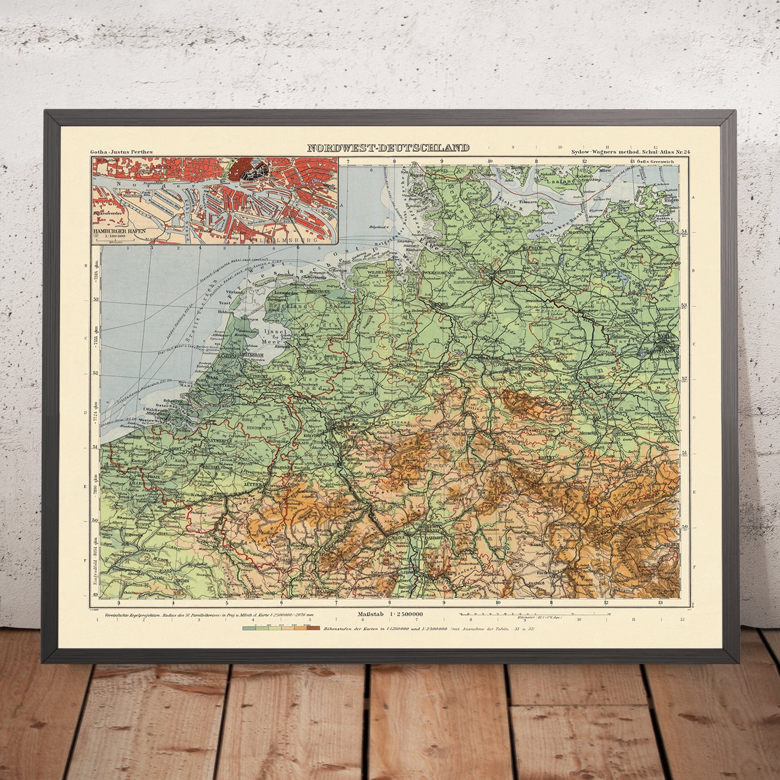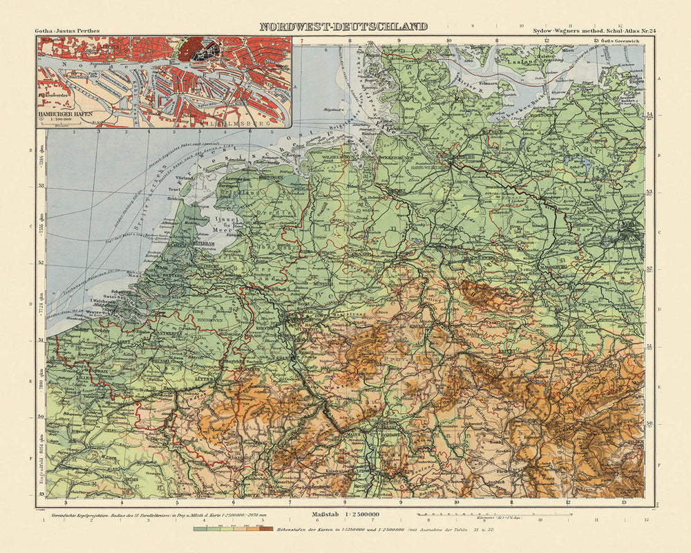 No. 24. Nordwest-Deutschland is a discerning synthesis of political and physical geography at a moment of intense historical change. Issued in 1943 by Justus Perthes in Gotha, it bears the intellectual lineage of Emil von Sydow while reflecting the rigorous stewardship of editors H. Haack and H. Lautensach, with cartographic review by O. Stollt. Set on a simplified conical projection that preserves form and orientation across a broad sweep, the sheet embraces northwest Germany and reaches into the Netherlands and Belgium, mapping coasts, rivers, borders, and settlements with poised clarity. Its color language and linework articulate hierarchy and function: the sober geometry of boundaries, the connective tissue of roads and railways, and the lifelines of waterways that sustained Europe’s northwestern seaboard.