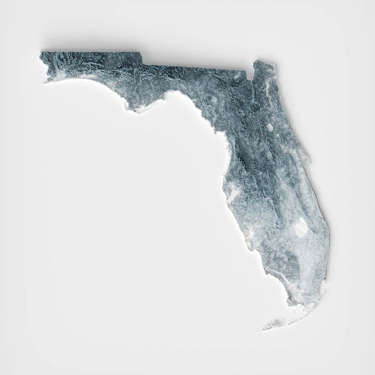 Traza las suaves curvas de la costa mientras fluye desde la extensión del panhandle hasta la icónica punta de los Keys, capturando las islas ondulantes, los arrecifes en alta mar y las cadenas de barrera que definen los límites acuáticos de Florida. Los Everglades están representados de manera impactante como una amplia y sutil extensión en el extremo sur, mientras que las extensiones planas del centro y norte de Florida se elevan casi imperceptiblemente en suaves y delicadas ondulaciones—enfatizadas por el juego de luz y sombra, que resalta delicadamente el ondulado Lake Wales Ridge y las antiguas colinas de arena cerca de Ocala.