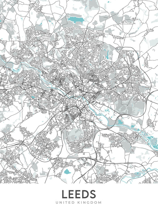Este mapa de Leeds es un callejero moderno y detallado sin etiquetas, centrado en el área urbana de la ciudad. Cubre una amplia gama de vecindarios, incluido el centro de la ciudad, Headingley, Hyde Park, Woodhouse, Burley, Kirkstall, Armley, Bramley, Stanningley y Pudsey. El mapa también incluye las principales carreteras, rutas, autopistas y puntos de referencia como el Ayuntamiento de Leeds, la Galería de Arte de Leeds, la Bolsa de Maíz de Leeds, el Mercado Kirkgate de Leeds, el Gran Teatro de Leeds, el Museo de la Ciudad de Leeds, el Museo de la Armería Real, la Casa Harewood, Temple Newsam y Parque Roundhay.