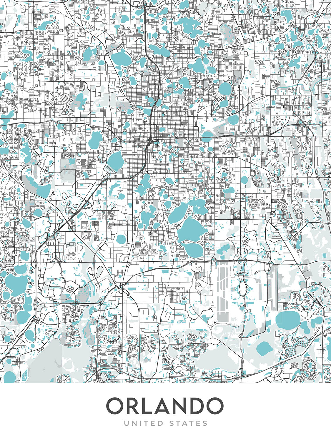 El mapa presenta un callejero moderno y detallado sin etiquetas, lo que le permite navegar fácilmente por la ciudad y descubrir nuevos lugares para explorar. El mapa también incluye carreteras y autopistas principales, así como puntos de referencia como el parque Lake Eola, el Museo de Arte de Orlando y el Museo Mennello de Arte Americano. Este mapa es perfecto para cualquiera que desee una forma elegante e informativa de explorar la ciudad de Orlando.