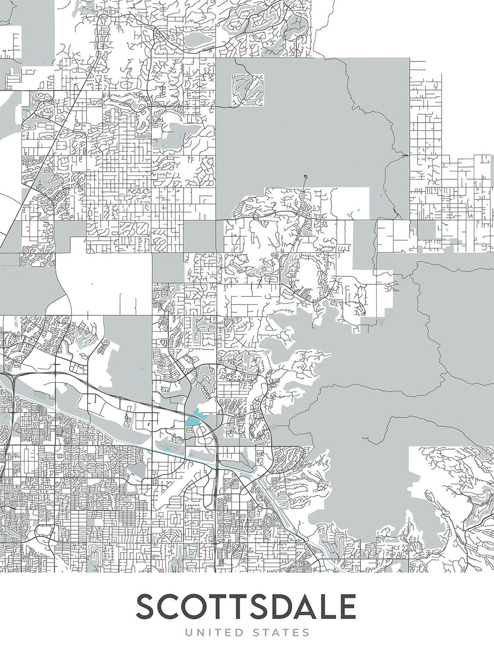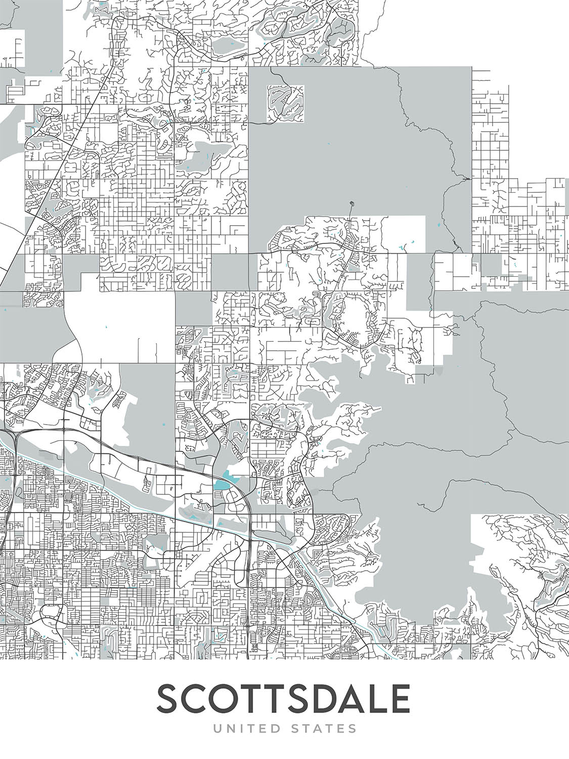 Este mapa de Scottsdale, Arizona, es un callejero moderno y detallado sin etiquetas, que se centra en los vecindarios, las principales carreteras y los puntos de referencia de la ciudad. El mapa cubre un área rectangular de aproximadamente 16 millas por 13,4 millas, con la ciudad de Scottsdale en el centro. El mapa es una obra de arte hermosa e informativa que será una gran adición a cualquier hogar u oficina.