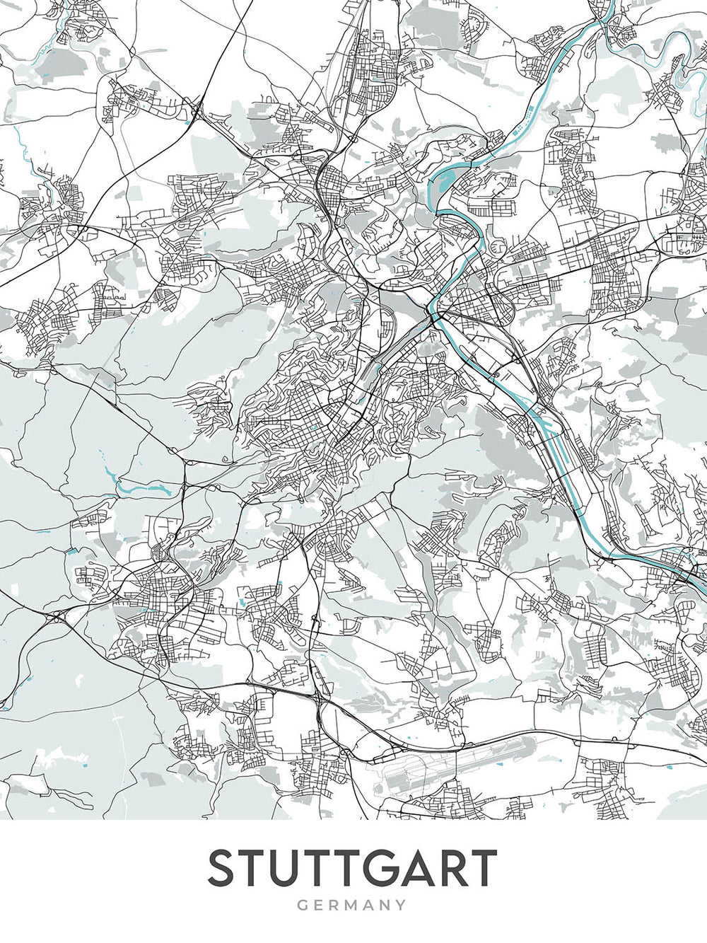 Este mapa de Stuttgart es un callejero moderno y detallado sin etiquetas, que se centra en la cartografía única, el diseño moderno y las combinaciones de colores únicas de la ciudad. Cubre una parte sustancial de la ciudad, incluida una amplia gama de vecindarios, carreteras principales, rutas, autopistas y puntos de referencia. El mapa está centrado en las coordenadas 48.77787N, 9.17882W y abarca un área de aproximadamente 16 millas por 13,4 millas.