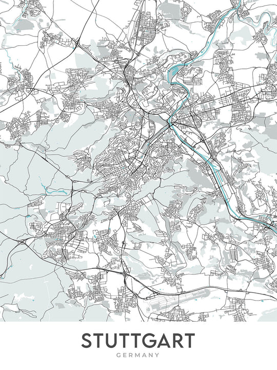 Mapa moderno de la ciudad de Stuttgart, Alemania: Fernsehturm, Museo Mercedes-Benz, Museo Porsche, Schloss Solitude, Staatsgalerie