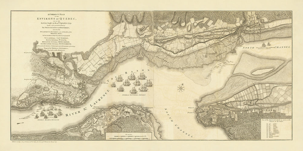 El mapa ofrece una vista completa de las posiciones y movimientos de las tropas francesas y británicas, las ubicaciones de la artillería y las divisiones navales. La inclusión de los barcos del Almirante Charles Holmes y del Almirante Sir Charles Saunders, junto con los campamentos del Brigadier Robert Monckton, el Mayor General James Wolfe y el Mayor Hardy, proporciona una instantánea detallada de la planificación estratégica y la ejecución del asedio. Este nivel de detalle permite a historiadores y entusiastas rastrear las rutas y estrategias exactas empleadas durante la batalla, ofreciendo una visión única de las tácticas militares del siglo XVIII.