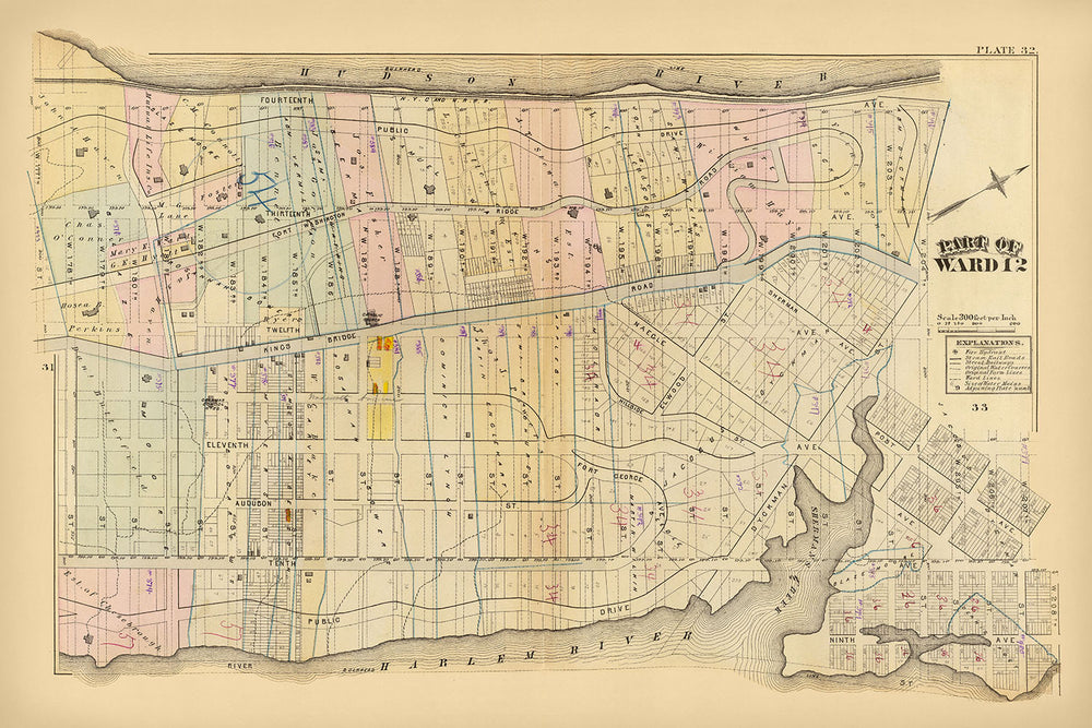 El parque Fort Washington, que aparece de forma destacada en el mapa, es otro punto destacado. Este amplio espacio verde proporcionó un respiro muy necesario del ajetreado entorno urbano, ofreciendo a los residentes un lugar para la recreación y la relajación. La importancia histórica del parque se ve reforzada por su asociación con Fort Washington, lo que lo convierte en un punto de referencia preciado que los neoyorquinos siguen disfrutando hoy en día.