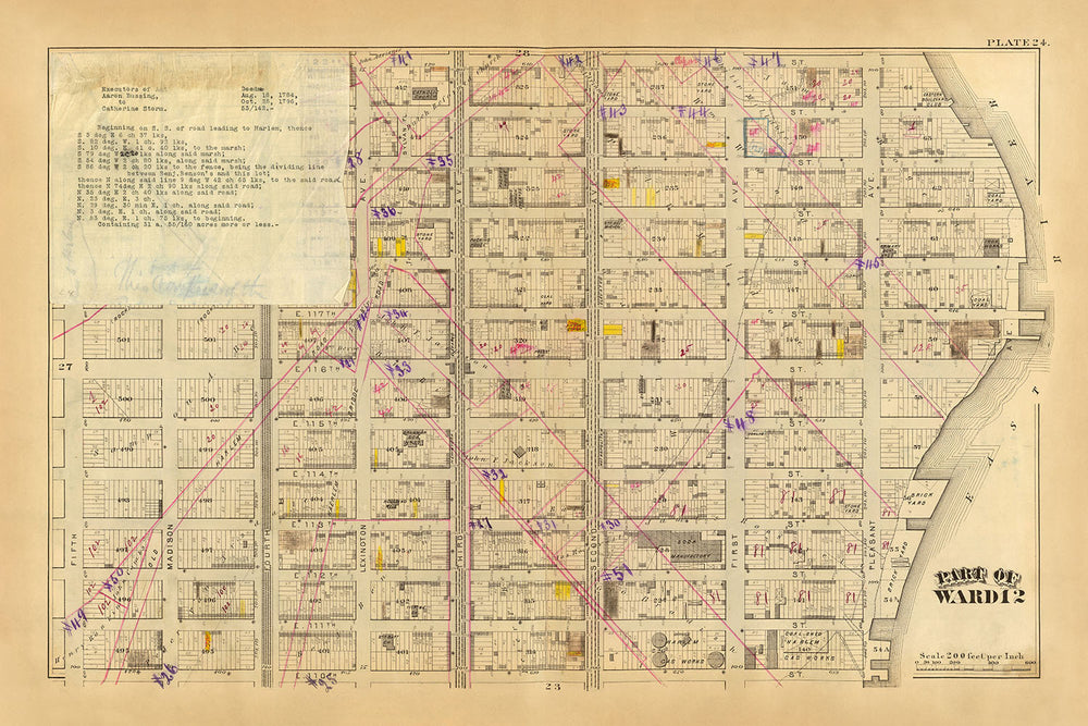 Se presta especial atención a los hitos importantes de la época, incluida la Iglesia Católica de San Pablo, la fábrica de refrescos y las oficinas y el cobertizo de carbón de Harlem Gas Works, lo que hace de este mapa no solo una herramienta de navegación sino también un documento histórico. Las anotaciones y la coloración vibrante mejoran el detalle y la profundidad del mapa, ofreciendo una rica historia visual de las calles y avenidas de East Harlem como eran hace más de un siglo.
