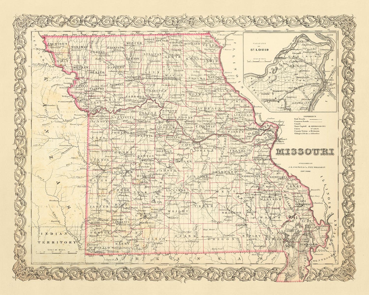 En conclusión, este antiguo mapa de Missouri de JH Colton es más que un simple artefacto histórico. Es un viaje al pasado, una celebración del arte de la cartografía y un tributo al legado perdurable de los asentamientos que han dado forma al estado de Missouri. Es una parte de la historia que puedes explorar, reflexionar y apreciar, un testimonio del extraordinario viaje que nos ha llevado hasta donde estamos hoy.