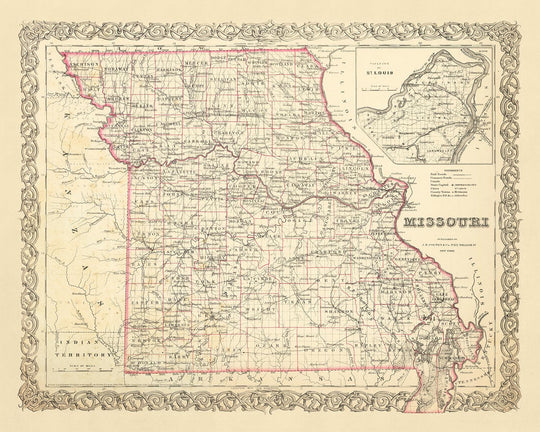 Sumérgete en el fascinante pasado de los Estados Unidos con este cautivador mapa antiguo de Missouri, meticulosamente elaborado por el estimado cartógrafo JH Colton en 1860. Esta pieza ofrece una visión única de un período formativo de la historia estadounidense, una época en la que la nación aún era en su infancia y el paisaje de Missouri era marcadamente diferente de lo que conocemos hoy. Es un testimonio extraordinario del incesante avance del tiempo, un recordatorio de lo lejos que hemos llegado y de cuánto ha cambiado en los últimos 150 años.