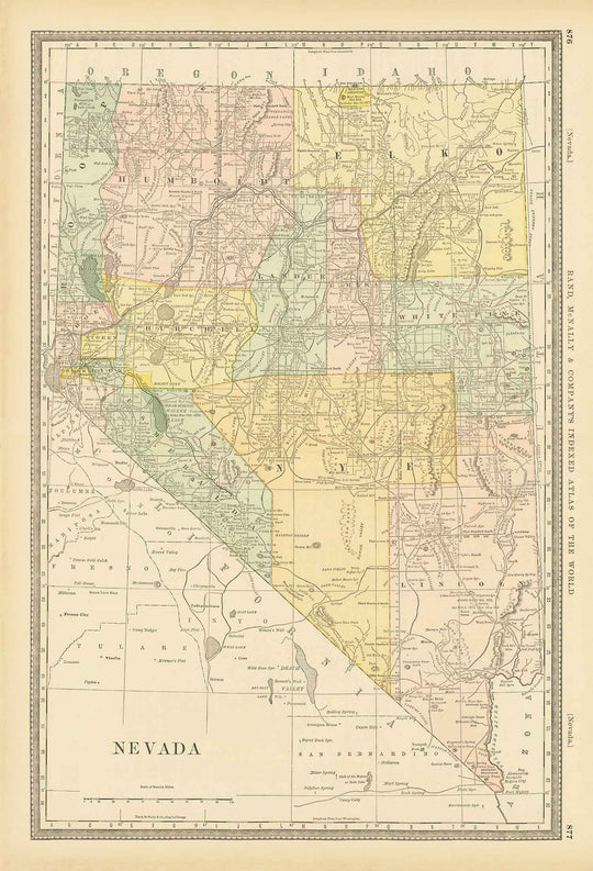 Antiguo mapa de Nevada, EE.UU., 1882 por Rand & McNally: Las Vegas, Reno, condados, Carson City
