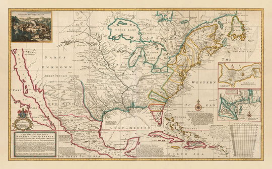 Este es uno de los mapas más antiguos y más detallados del interior de América del Norte. Se compiló en un punto intrigante de la historia cuando la mayor parte del centro del continente se llamaba Luisiana o Nueva Francia, y México y la Costa Oeste fueron reclamadas por España. La costa este, por supuesto, fue reclamada por Inglaterra!