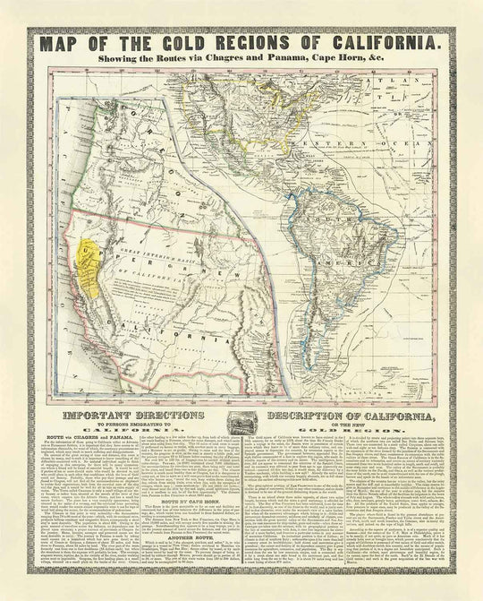 El mapa también fue diseñado para ayudar a las personas a llegar a California desde todo el mundo, con un pequeño mapa de América del Norte y del Sur que muestra las diversas rutas hacia la costa oeste de EE. UU.