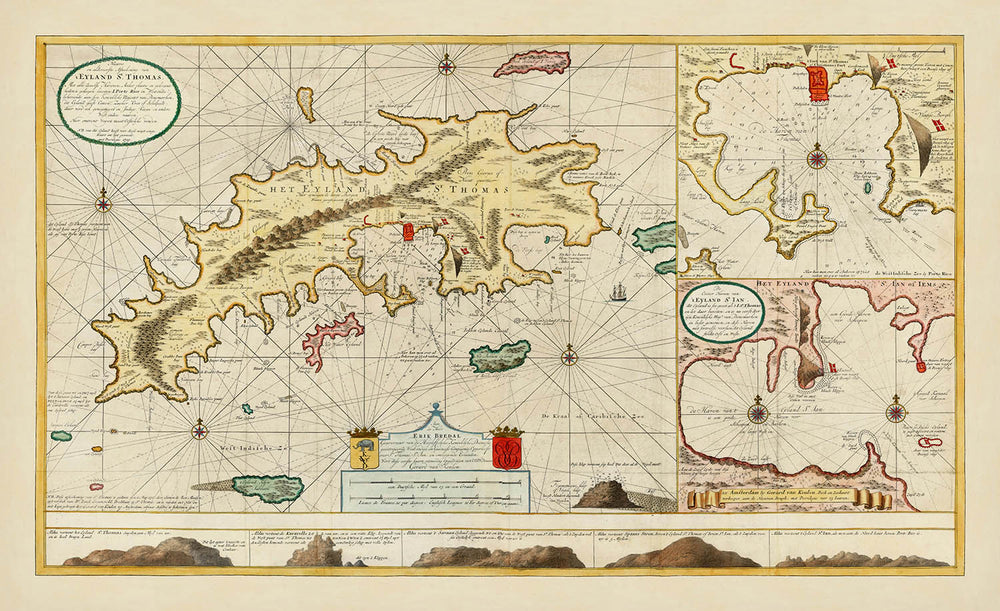 La "Nieuwe en Aldereerste Afteekening van 't Eyland St. Thomas" es un magnífico mapa náutico creado por el estimado cartógrafo Gerard Van Keulen en 1719. Este exquisito mapa captura la isla de St. Thomas en las Islas Vírgenes con un detalle inigualable, mostrando su topografía, puertos y fortificaciones. La dedicación de Van Keulen a la precisión es evidente en la intrincada representación de sondeos y bancos de arena, proporcionando valiosos conocimientos sobre los desafíos de navegación de la época. El mapa está adornado con líneas de rumbo y barcos de vela, ofreciendo un vistazo al mundo marítimo de principios del siglo XVIII.