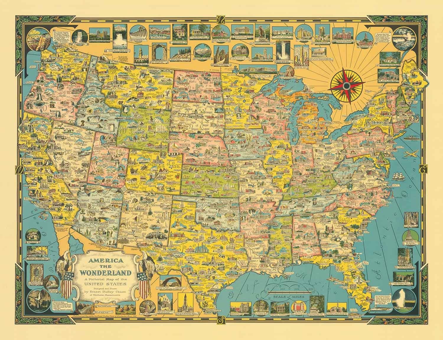 Hay literalmente cientos de pequeñas ilustraciones altamente detalladas de todos los principales monumentos del país, como el Rose Bowl en Los Ángeles, el árbol más alto del mundo en el norte de California y el Lincoln Memorial en Washington DC. Un hermoso cartucho, flanqueado por dos águilas calvas, indica el nombre de este mapa: "América el País de las Maravillas."