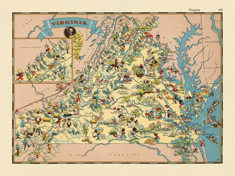 Pictorial Map of Virginia by Ruth Taylor White, 1935: Richmond, Norfolk, Chesapeake Bay, Blue Ridge Mountains, Jamestown