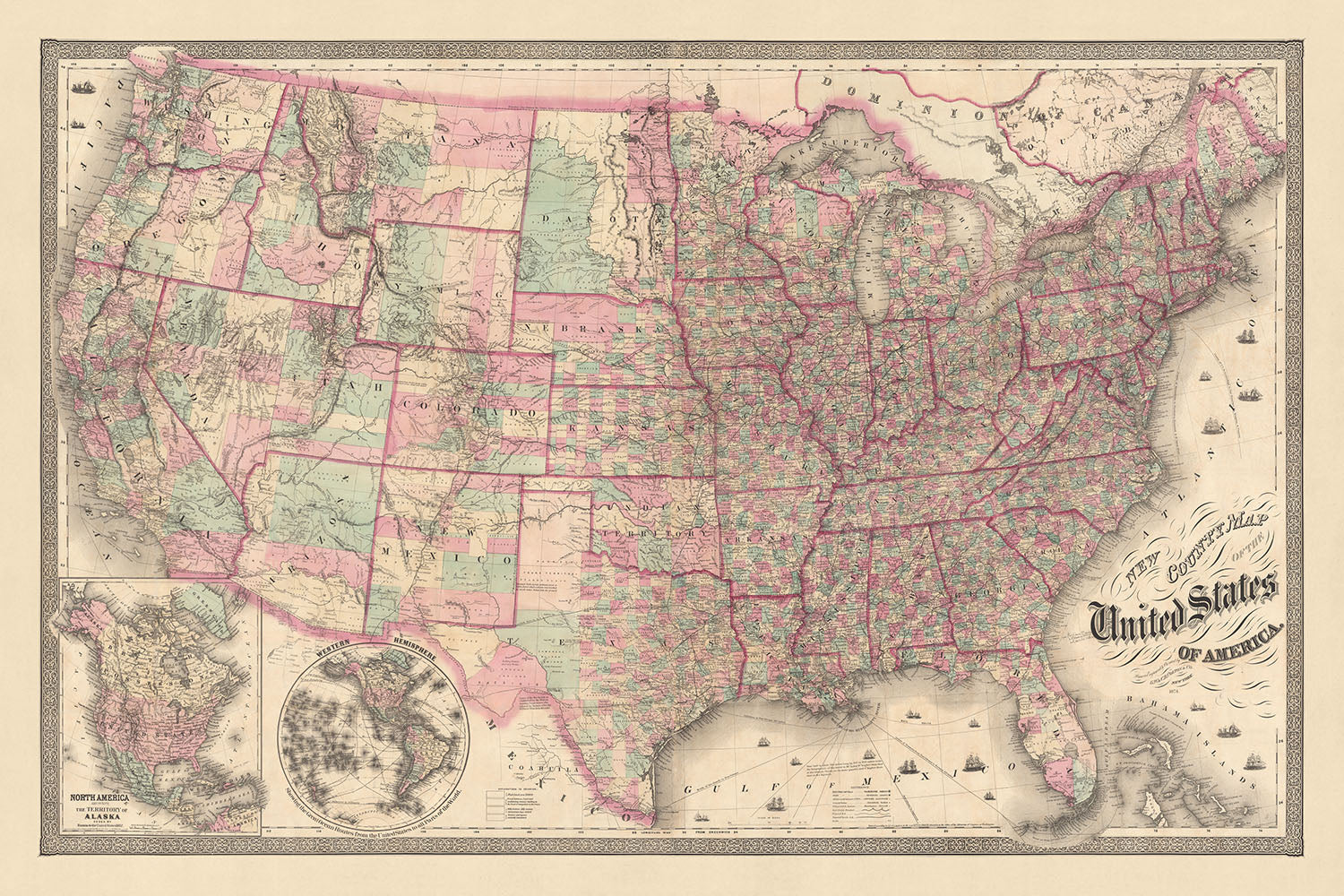 Antigua y rara mapa del condado de los Estados Unidos por GW Colton, 1874