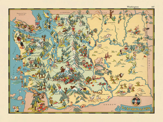 Ruth Taylor White’s artistry is immediately evident in the map’s playful, cartoon-like style, which transforms Washington’s geography into a visual feast. The map is adorned with vibrant depictions of the state’s most iconic natural features: the snow-capped majesty of Mount Rainier and Mount St. Helens, the rugged expanse of the Cascade and Olympic Mountains, and the winding course of the mighty Columbia River. Along the Pacific coastline, maritime scenes and ships evoke the state’s enduring connection to the sea, while the lush, forested interior is brought to life with images of lumberjacks and the thriving timber industry.