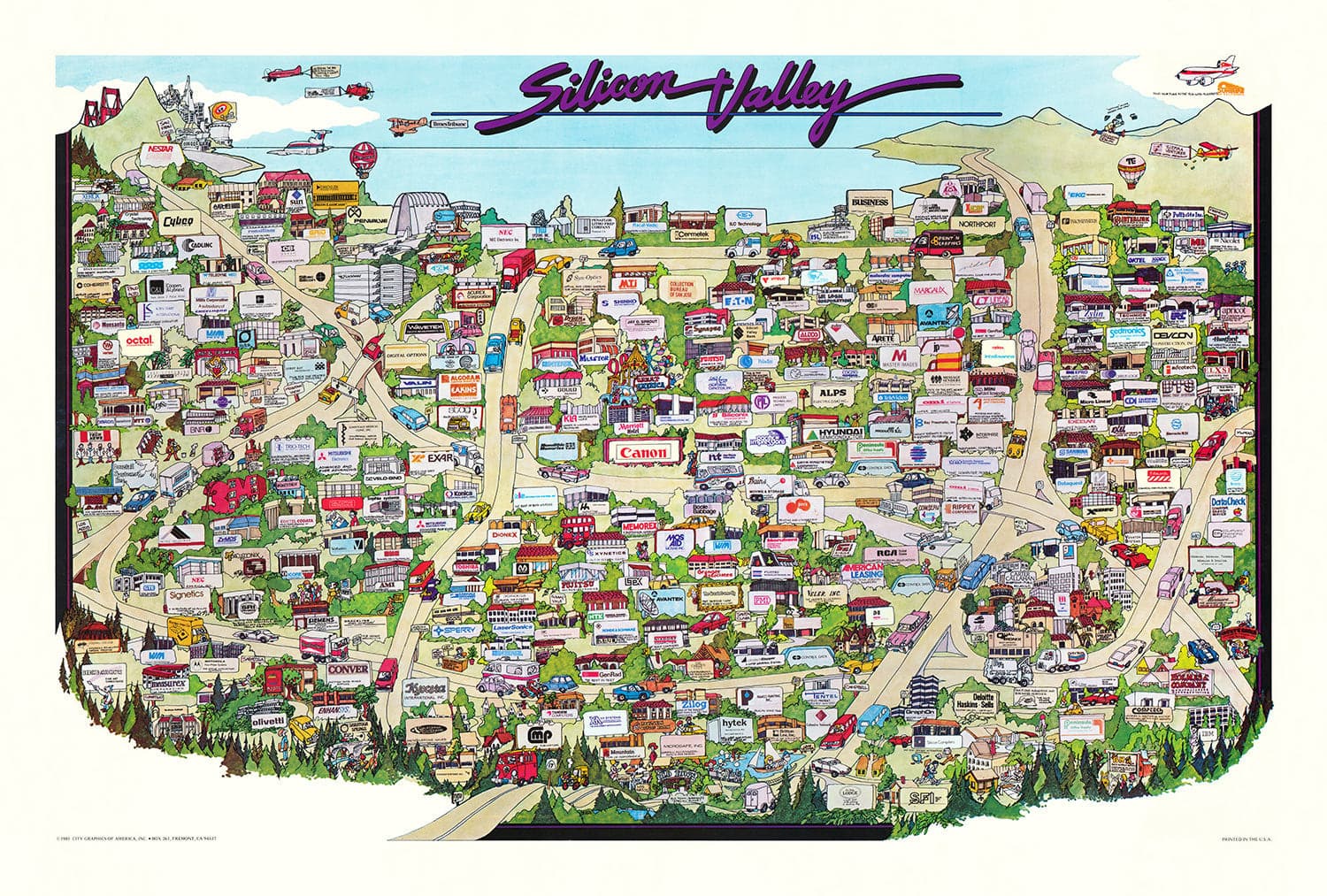 Rare Old Map of Silicon Valley, 1985: Gráfico pictórico de MountainView, Sunnyvale, Cupertino, San Jose, Fremont