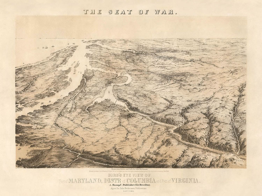 La "Sede de la Guerra" de John Bachmann. Vista aérea de parte de Maryland, el Distrito de Columbia y parte de Virginia, es una extraordinaria litografía en color antigua de 1861. Esta pieza icónica ofrece una vista panorámica del teatro Virginia-Maryland durante la Guerra Civil de EE. UU., capturando el paisaje al borde del conflicto. La obra de Bachmann refleja el brillo técnico y el alcance imaginativo que definen sus vistas aéreas.