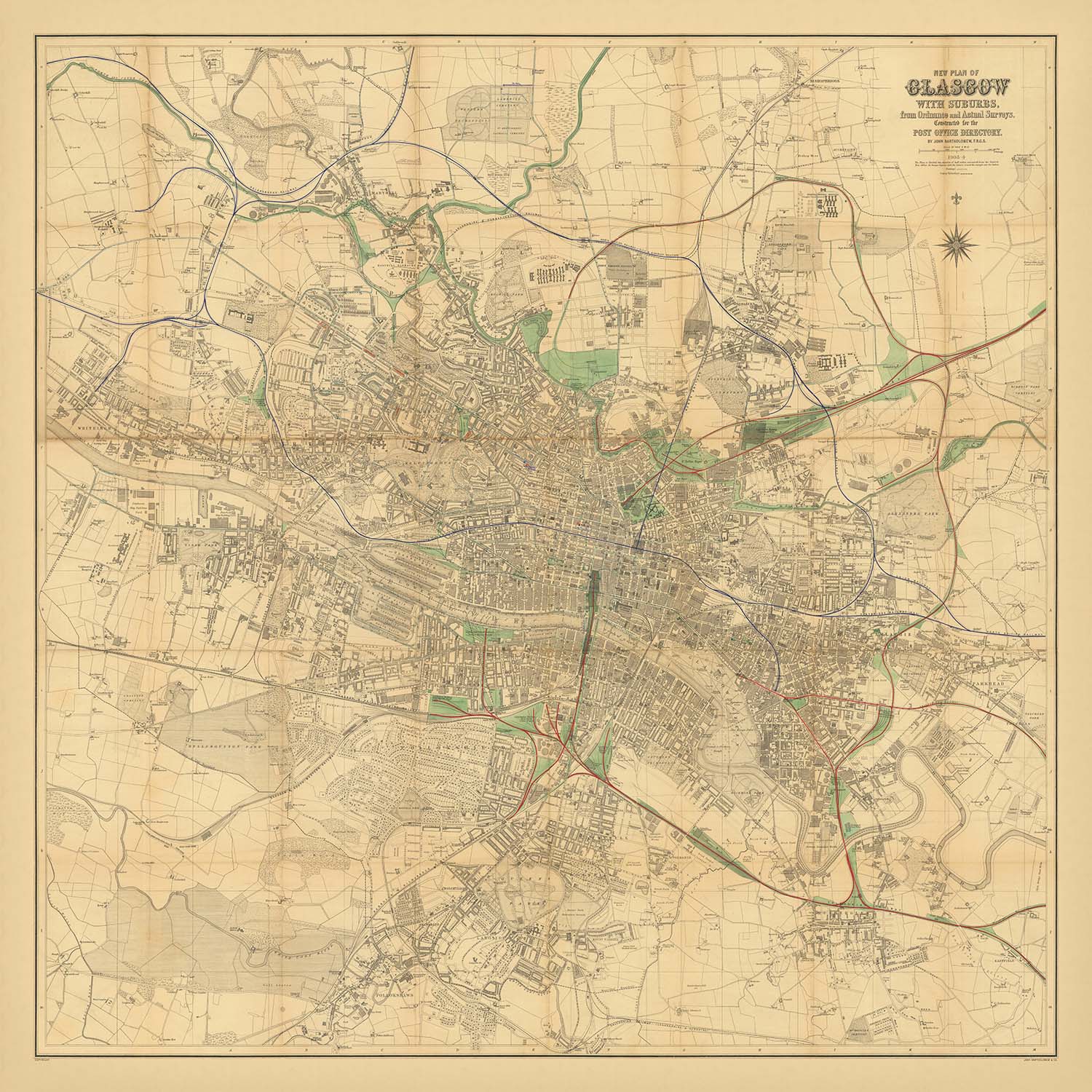 Más allá de su núcleo urbano, el mapa revela espacios verdes y parques que proporcionaron un respiro de la bulliciosa vida citadina. Estas áreas, junto con la detallada representación de las calles e infraestructura de Glasgow, reflejan el compromiso de la ciudad de equilibrar el crecimiento industrial con la calidad de vida. Este mapa no es solo una herramienta de navegación; es un documento histórico que captura el espíritu de Glasgow en un momento crucial de su historia, convirtiéndolo en una valiosa adición a cualquier colección de mapas históricos.