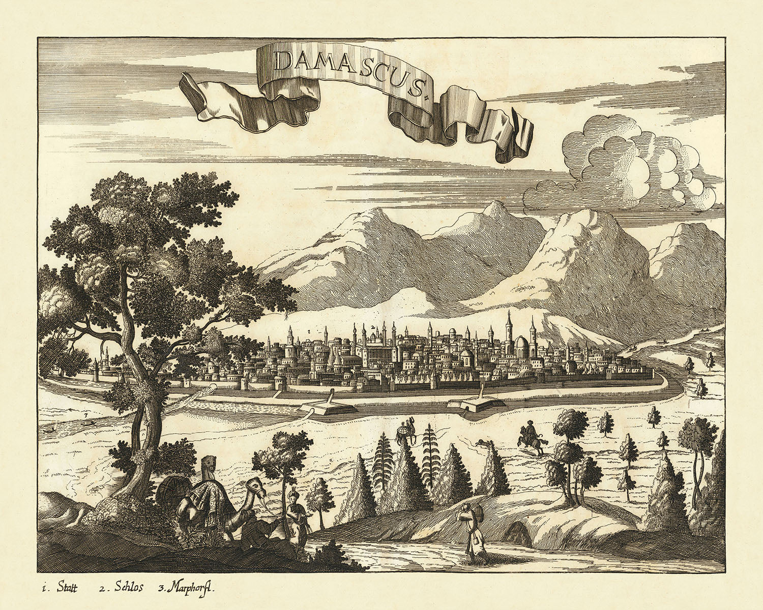 Este mapa de Damasco no es sólo una representación geográfica, sino una ventana al pasado, que destaca los barrios y puntos de referencia importantes de la ciudad. Los edificios agrupados y las calles sinuosas de la antigua ciudad están meticulosamente detallados, lo que permite vislumbrar el diseño urbano de Damasco a finales del siglo XVII. Las prominentes cúpulas y minaretes que salpican el horizonte están bellamente ilustradas, lo que refleja el patrimonio arquitectónico de la ciudad y su importancia como centro de cultura y aprendizaje islámicos.
