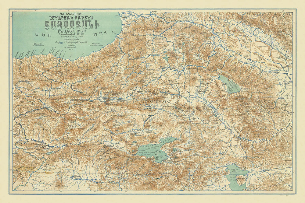 El diseño y estilo del mapa son un testimonio del arte cartográfico de la época. Con texto completamente en armenio, refleja una mezcla única de orgullo cultural y defensa política. Los intrincados detalles de las características físicas, como ríos y montañas, ofrecen un vistazo al rico paisaje natural de la región, invitando a los espectadores a explorar las narrativas históricas incrustadas dentro de sus fronteras.